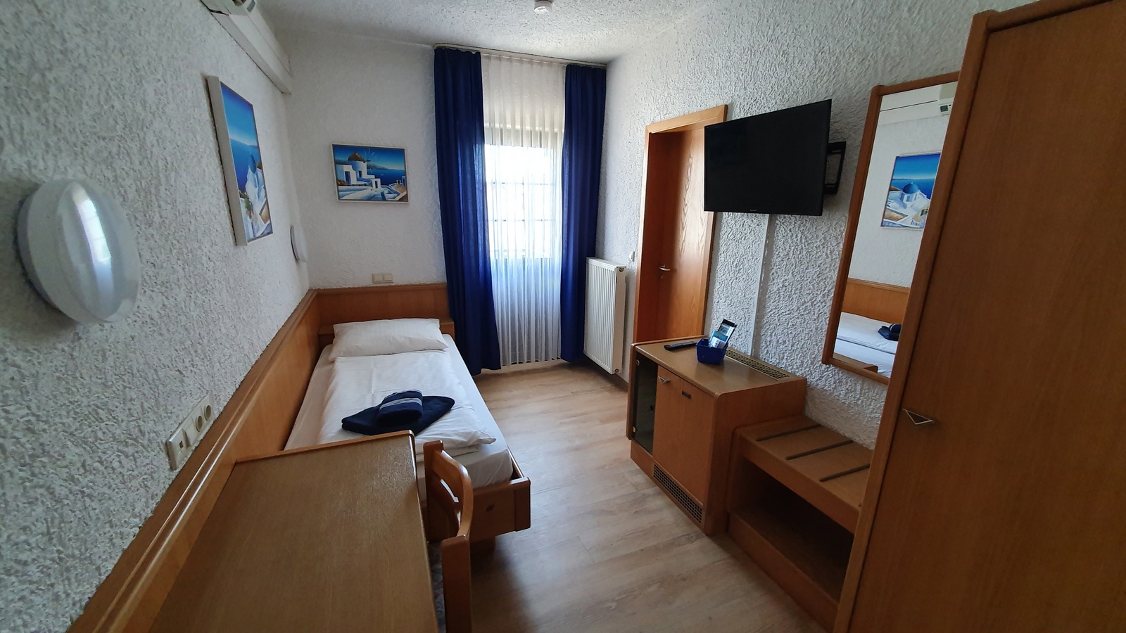 Bett, ein kleiner Kühlschrank, SAT-TV und WLAN